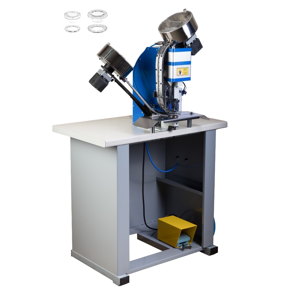 Máquina neumática automática con doble distribuidor para colocación de ojales y arandelas de plástico de 8 a 16 mm.